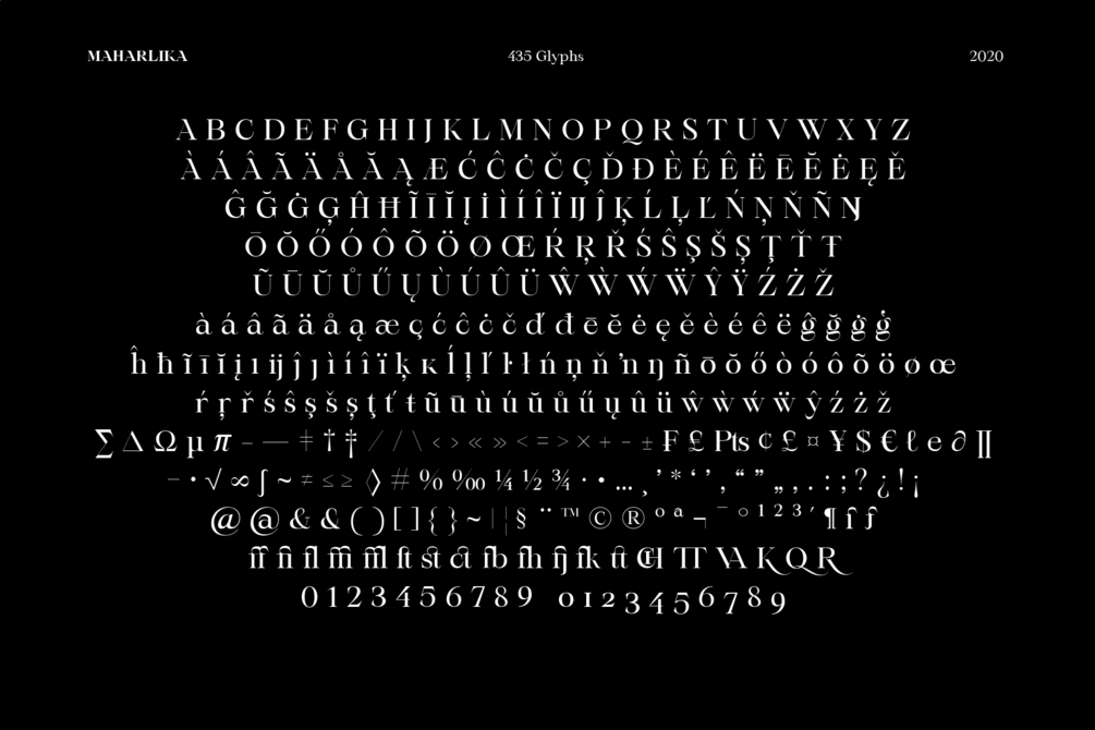 Maharlika (Freeman) in Filipino is a luxurious, contemporary style serif typeface. It's intended to be used for display, branding or short to medium length texts. This typeface is multilingual, has 435 glyphs, and available in one weight: Regular.
